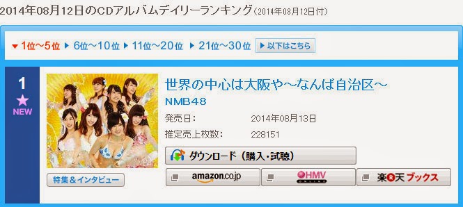 NMB48's 2nd album "Sekai no Chuushin wa Osaka ya ~Namba Jichiku~" sold 228,151 (estimated) copies at first day sales and become #1 at Oricon album chart in 12 August 2014.