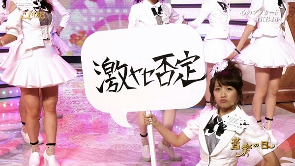 AKB48 performed at TBS music show "Ongaku no Hi (Music day)" at 2 August 2014, while AKB48 members were performing their new single song "Heart's placard" at the show, AKB48 general manager Takahashi Minami suddenly put her own placard "Super Thin, Deny".