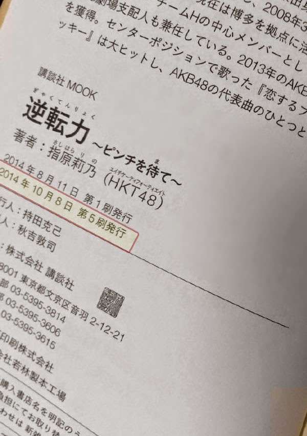 Good news to HKT48 manager Sashihara Rino, her book "逆転力~ピンチを待て~" (Gyakutenryoku ~Pinch wo Mate~) keeps selling well, the publisher KODANSHA has decided to print again at October 8, 2014.