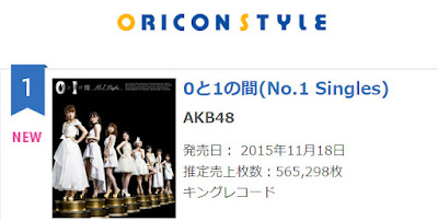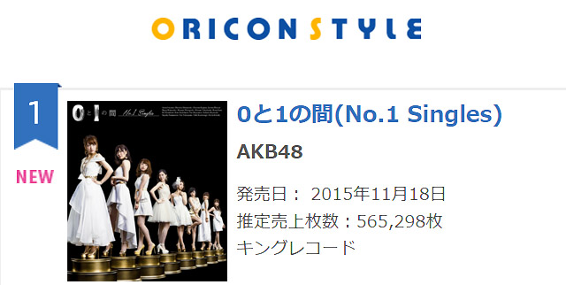 AKB48 7th album "0 to 1 no aida" (0と1の間) first day sold 565,298 copies, and rank no. 1 at Oricon daily chart at 18 November 2015.