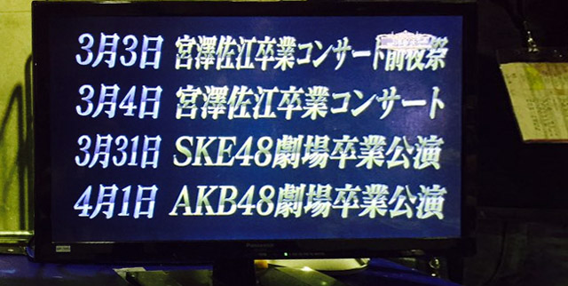 It was announced in 48G Request Hour 2016, Miyazawa Sae (宮澤佐江) will hold her graduation concert in Nippon Gaishi Sports Plaza, Nagoya in 3-4 March 2016.