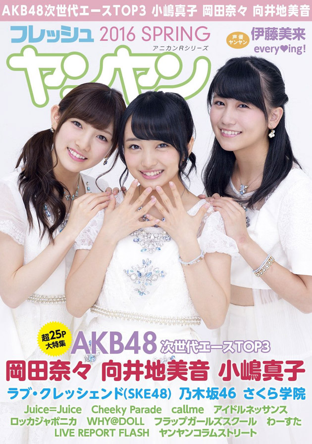 AKB48's next generation ace Top 3 members Okada Nana (岡田奈々), Mukaichi Mion (向井地美音) and Kojima Mako (小嶋真子) will be cover girls of Anikan R YANYAN!! (Fresh 2016 Spring issue), the magazine will be release at 5 February 2016.