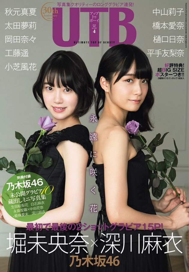 Nogizaka46 members Hori Miona (堀未央奈) and Fukagawa Mai (深川麻衣) will be cover girls of magazine UTB (2016 April issue). The magazine will be released at 23 February 2016.