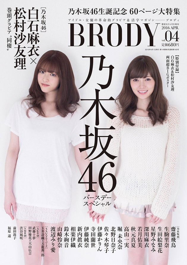 Nogizaka46 members Matsumura Sayuri (松村沙友理) and Shiraishi Mai (白石麻衣) will be cover girls of magazine "BRODY" (2016 vol. 4), the magazine will be released at 22 February 2016.
