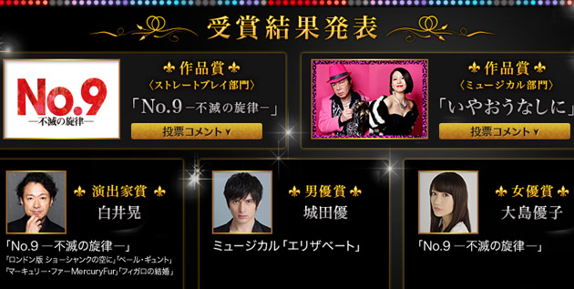 No. 9 Fumetsu no Senritsu and its director Shirai Akira (白井晃 ) also win Best Work and Best Director Awards in the category "Straight Play" respectively. The prizes are awarded through public voting.