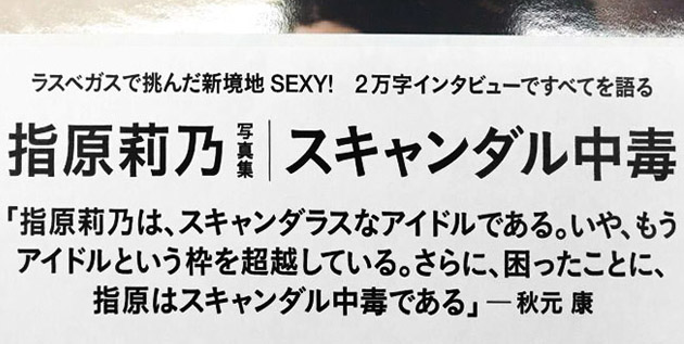 AKB48 producer Akimoto Yasushi revealed a new photo of Sashihara Rino (指原莉乃)'s 3rd Photo Book "Scandal Addiction" (スキャンダル中毒) on his 755 at 11 February 2016.