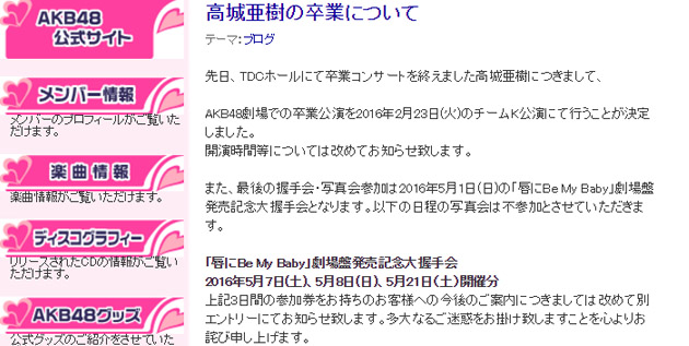 AKB48 official blog has announced AKB48 Team K member Takajo Aki (高城亜樹)'s graduation schedule, her graduation Live Performance date will be 23 February 2016.