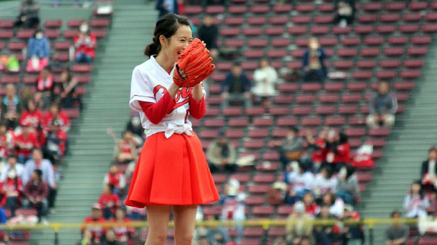 Former AKB48 member Maeda Atsuko (前田敦子) threw out ceremonial first pitch for baseball team Hiroshima Toyo Carp in Mazda Zoom-Zoom Stadium on 6 March 2016.