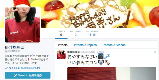SKE48 member Matsui Jurina (松井珠理奈) has opened her official Twitter by her 19th birthday (8 March 2016). It was announced by SKE48 official Twitter.