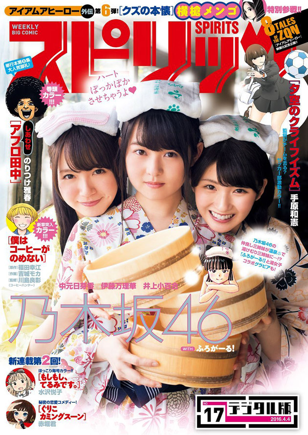Nogizaka46 members Nakamoto Himeka (中元日芽香), Ito Marika (伊藤万理華) and Inoue Sayuri (井上小百合) will be cover girls of manga magazine "Weekly Big Comic Spirits" (4 April 2016 issue), the magazine will be released at 19 March 2016.